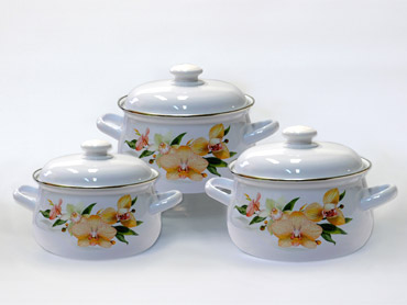 Набор посуды "Дикая орхидея", изготовленный из стали, покрытой эмалью, состоит из 3 кастрюль с крышками вместительностью 4,5 литра, 3 литра и 2 литра. На наружную поверхность корпуса и крышки, покрытых светлоокрашенной эмалью и тонированных цветными эмалями, нанесены деколи. Допускается на крышке изделия только тонирование цветными эмалями (без деколи). Борта корпуса и крышки изделия защищены ободком из антикоррозийной стали. Арматура на крышке изделия пластмассовая, на корпусе полая